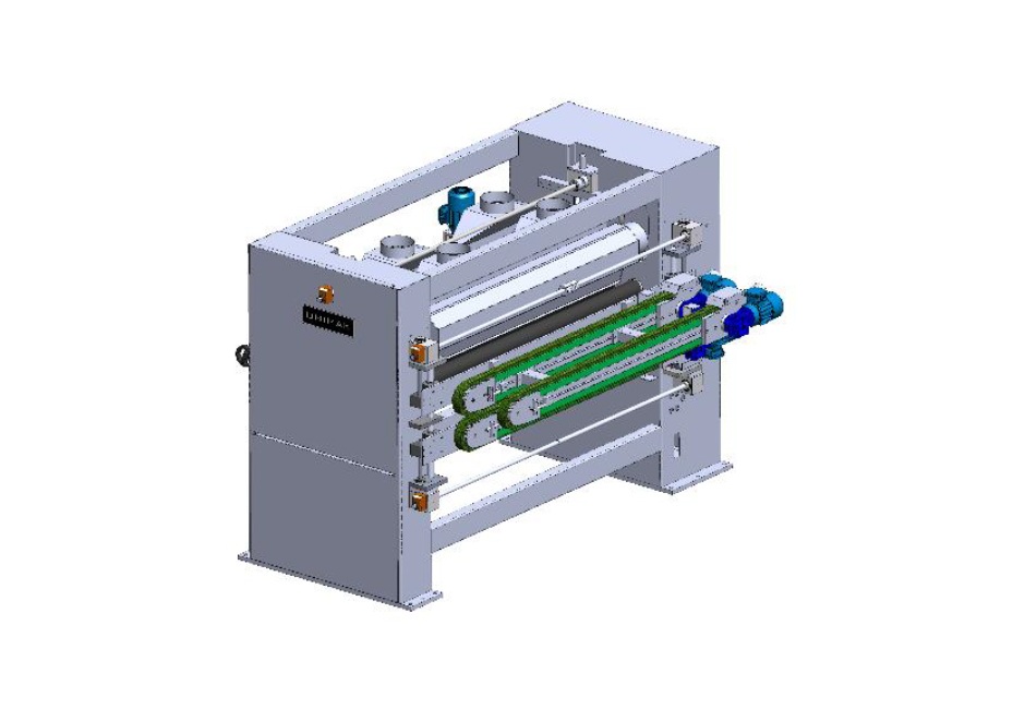 Панель проходит между приводными верхним и нижним валами. Верхний вал регулируется по высоте пневматическими механизмами.