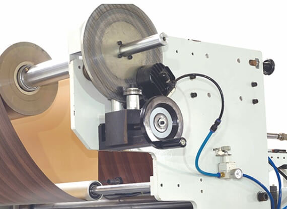 На подающем валу установлен электронный дисковый тормоз с системой контроля натяжения пленки. Усилие натяжения выставляется в соответствии с используемым материалом и поддерживается постоянным в зависимости от диаметра рулона, что предотвращает возможный обрыв тонких деликатных материалов.