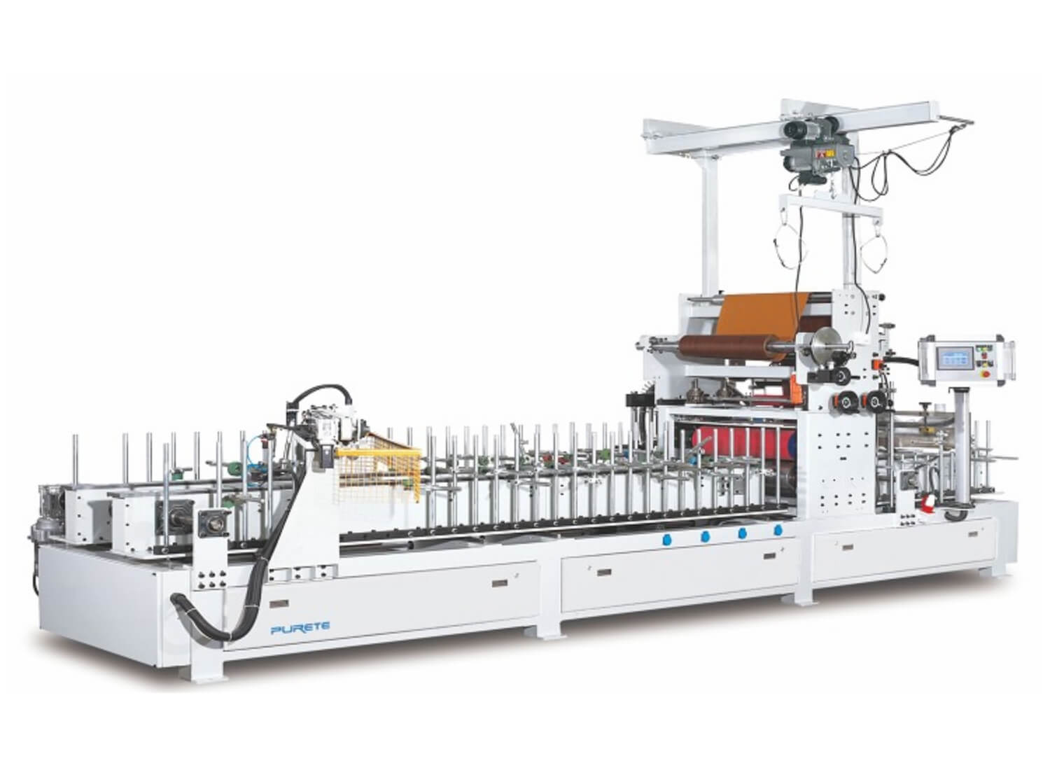 Линия каширования PURETE BF-126-L предназначен для облицовывания стеновых панелей, плитных отделочных материалов, дверных полотен (в том числе и с четвертью) с использованием рулонных облицовочных материалов (плёнок ПВХ, финиш-бумаг, шпона, CPL-пластика) и клея-расплава ПУР.