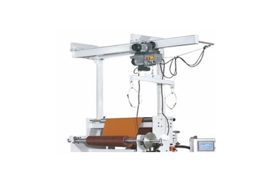 Для удобства установки тяжелых рулонов на размоточный вал на станке установлен специальный кран с лебедкой, грузоподъемностью до 300 кг. и диаметром до 400 мм.