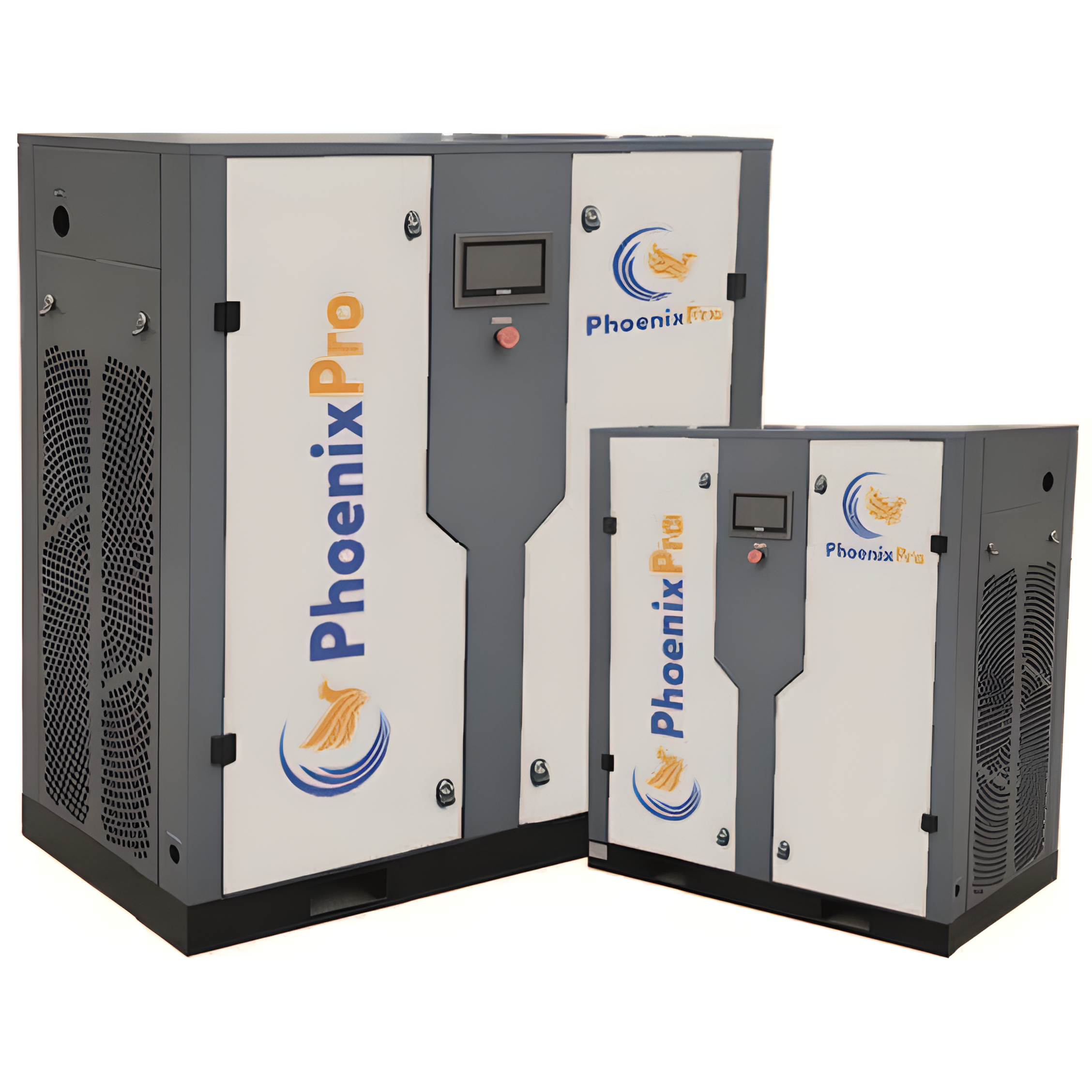 Компрессоры PhoenixPro. являются результатом совершенно нового взгляда на конструкцию винтовых компресcоров. На оборудование устанавливается объемный винтовой блок, позволяющий достигать хороших показателей производительности. Вращение главного ротора винтового блока обеспечивается прямой непосредственной передачей 1:1 от электродвигателя через гибкую муфту, что исключает передаточные потери, снижает затраты на производство сжатого воздуха, увеличивает надежность и экономит на сервисе упрощая обслуживание. Радиатор с большой площадью охлаждения, обеспечивает стабильную бесперебойную работу даже в высоконагруженных условиях. Управление пуском и работой компрессора осуществляется микропроцессорным блоком управления. Контроллер предоставляет возможность объединять компрессоры в группы и обеспечивать эффективное управление.