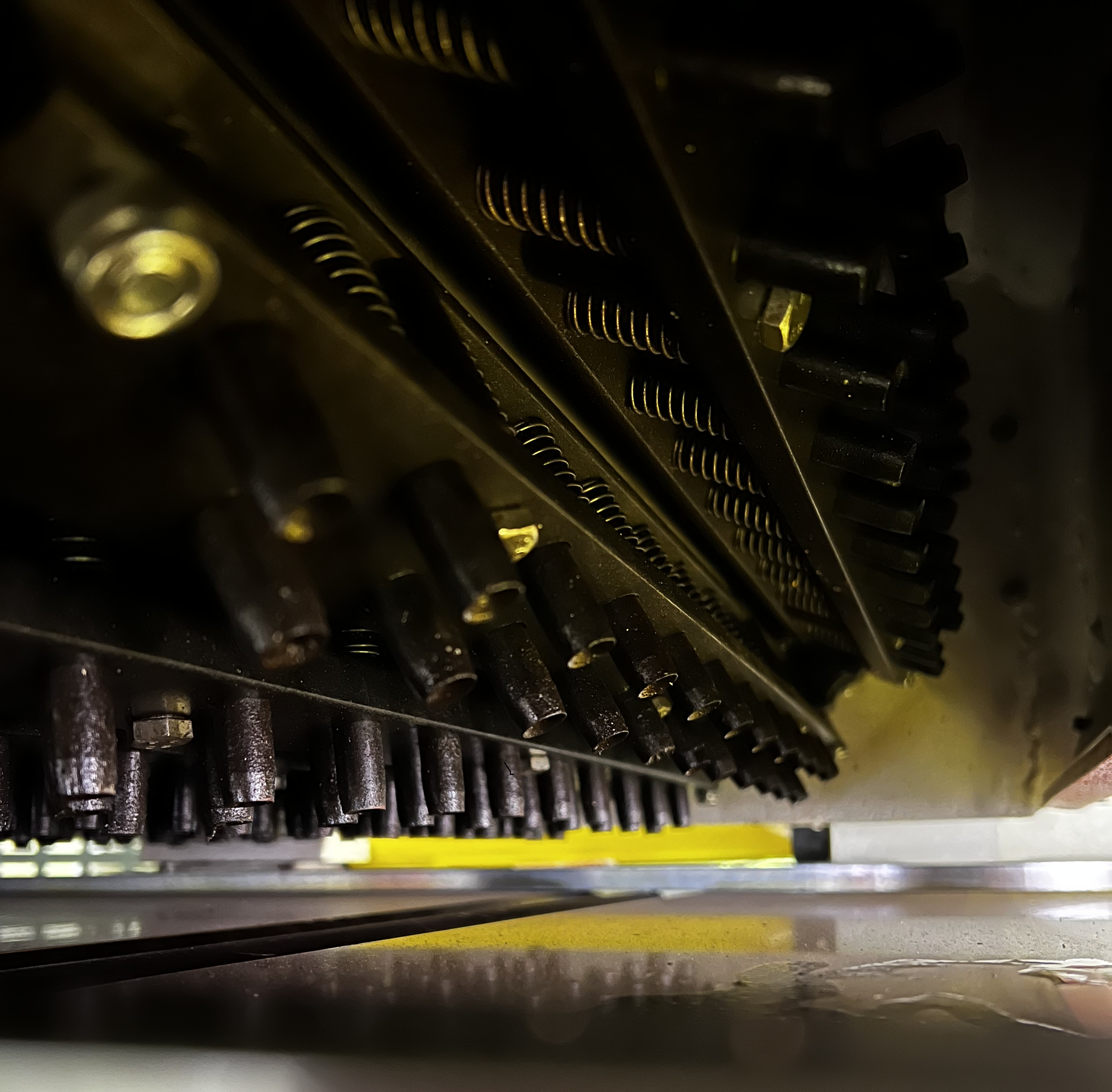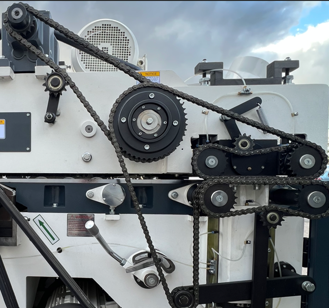 ПОДАЮЩИЙ КОНВЕЙЕРМеханизм подачи представляет собой металлическую конвейерную ленту с подпружиненными независимыми пальцами. Такая конструкция обеспечивает точечное прижатие заготовки с любым качеством поверхности, а также позволяет обрабатывать одновременно несколько заготовок имеющих разнотолщинность до 3 мм. |