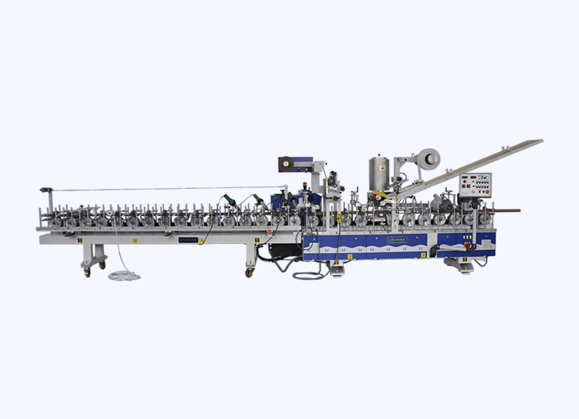 Станок для облицовывания панелей и профильных погонажных изделий с щелевым клеенаносящим соплом и плавителем (возможность работы с PUR клеем-расплавом) и вальцовым клеенаносящим узлом.